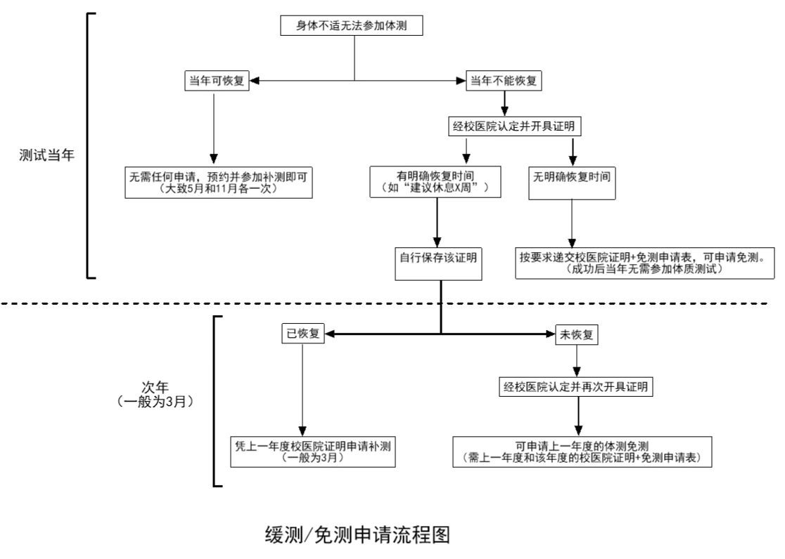 注:学生免测相关材料由各学院负责统一收齐、核实[校医院证明、免测申请表(附件1)、免测汇总表(附件2)],经学院学工办审核盖章后于本学期补测结束后统一交至体质测试中心(具体时间另行通知)。经体测中心核准后,对符合条件的学生予以免测处理,本年度免予执行《国家学生体质健康标准》测试。
